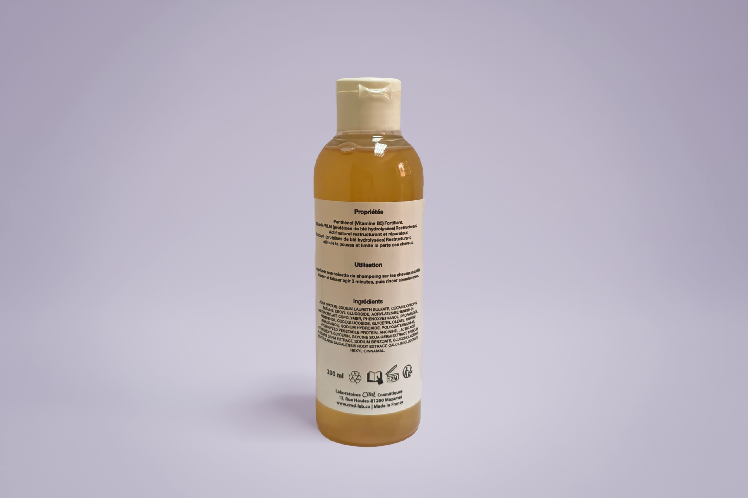 Aqua, Sodium cocoyl Sarcosinate, Decyl glucoside, Acrylates/Beheneth-25 Méthacrylate copolymer, Cocamidopropylbetaine, Phenoxyethanol, Propanediol, Panthenol, Coco-glucoside, Sodium cocoyl apple amino acids, Sodium Chloride, Hydrolysed Wheat Proteins, Perfume, Polyquaternium-47, Arginine, Lactic Acid, Sodium Hydroxide, Ethylhexylglycerin, Glycine Soja germ extract, Triticum vulgare germ extract, Sodium Benzoate, Scutellania Baicalensis root extract, CI19140, CI42051, Hexyl Cinnamal.